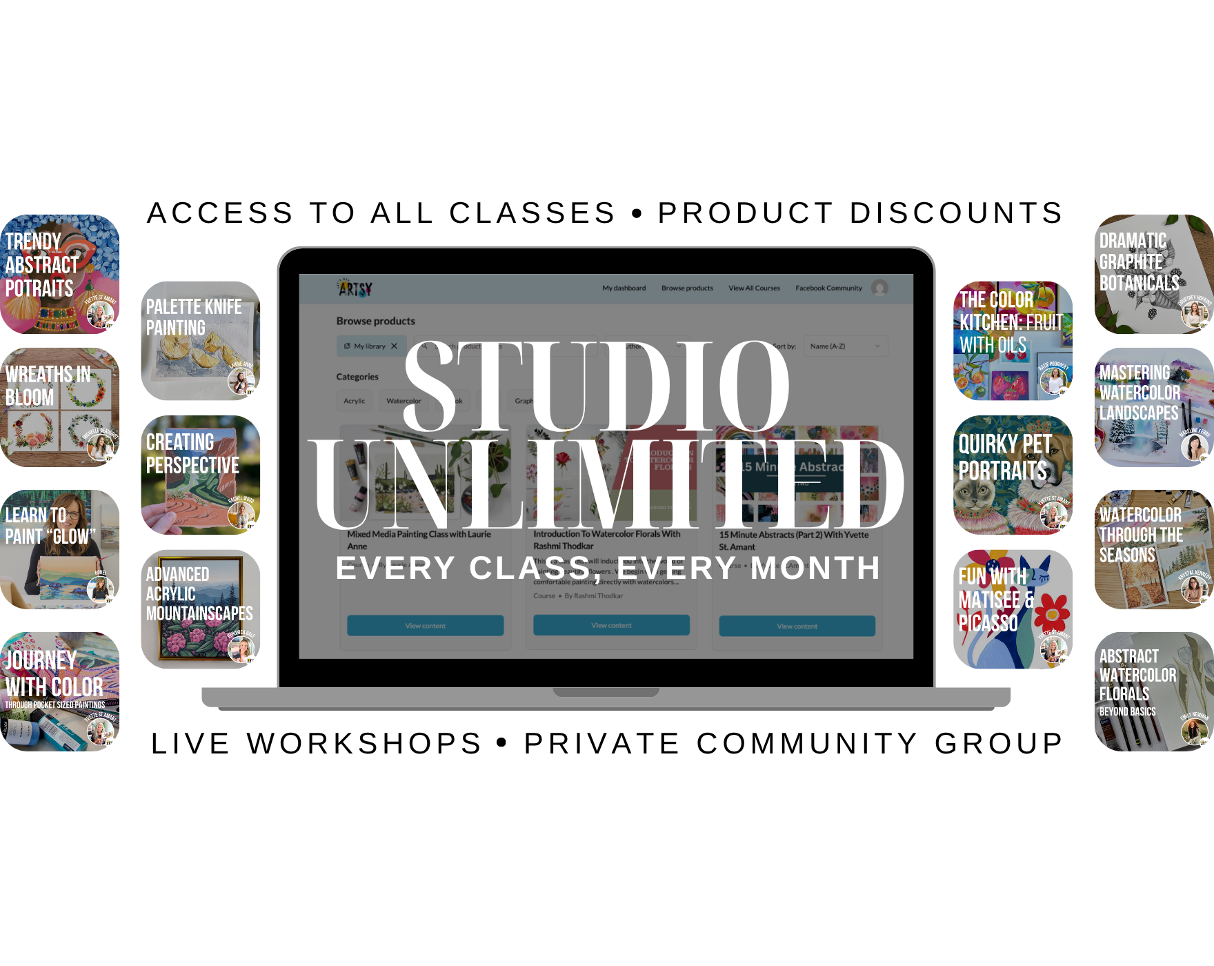 Go on, try us for free! Once you're enrolled in the Studio Unlimited membership, you'll receive instant access to hundreds of courses, live workshops, and the exclusive members only community.